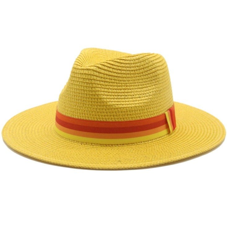 Optez pour la couleur et distinguez-vous avec originalité en portant le chapeau de paille jaune. Ce modèle classique se distingue de par son coloris de caractère. Il est accompagné d'une lanière multicolore apportant une touche de raffinement. un couvre-chef de forme fedora incontournable.